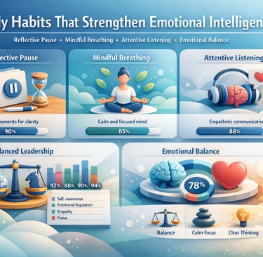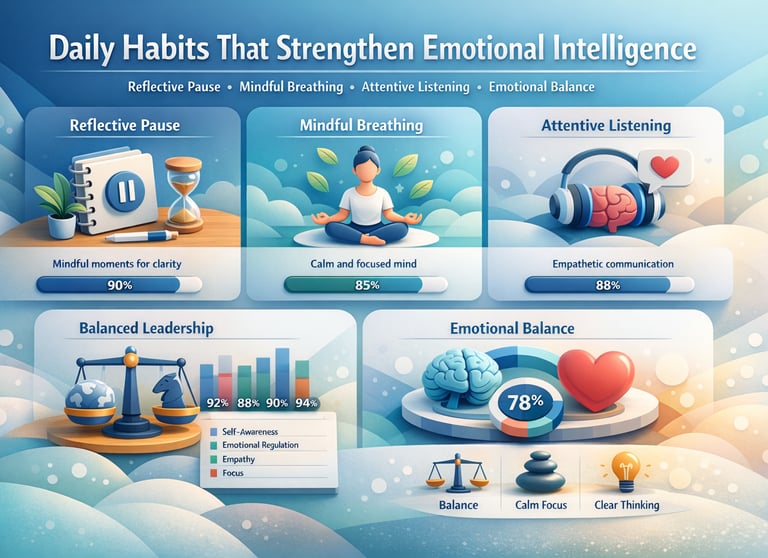 Emotional intelligence grows through daily awareness. Simple practices such as reflective pauses, mindful breathing, and attentive listening cultivate emotional balance. Traditional practices valued quiet reflection. Modern science confirms that small, consistent habits reshape emotional patterns.